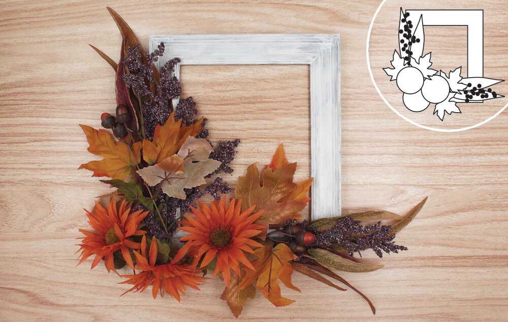 Select and arrange fall flowers and leaves to create a pleasing arrangement. Lay them out to get an idea of their position. Refer to the illustration for placement. Once your arrangement is set, cut the stems to size with wire cutters.