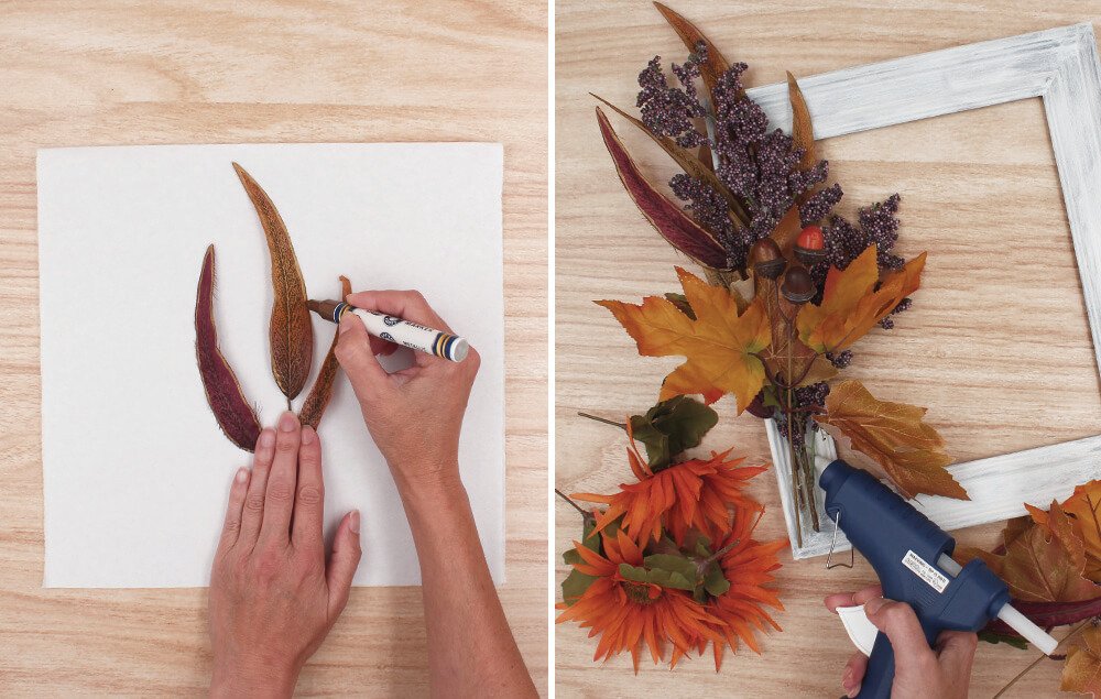 Hot glue the flowers and leaves into place on the frame.
