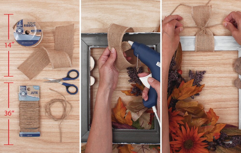 Wrap the burlap ribbon around the top of the frame and overlap the ends. Glue the ends to make a loop.