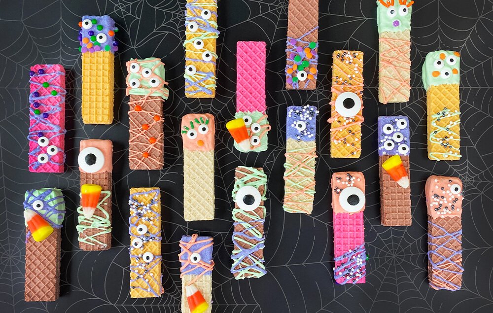 These delightful sugar wafer treats are brought to life with spooky sprinkles, creepy candy eyes, and drizzled chocolate in fun Halloween colors, making each bite a playful adventure!