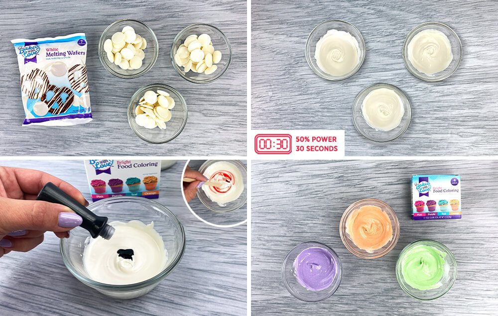 A) Pour the wafers into small microwave-safe bowls; one bowl for each color you would like to make.