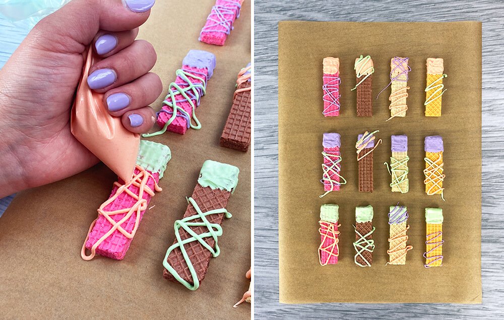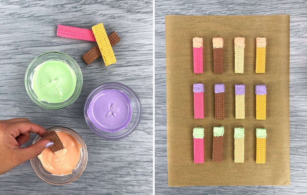 A) Dip the ends of the wafer cookies into the melted chocolate colors.