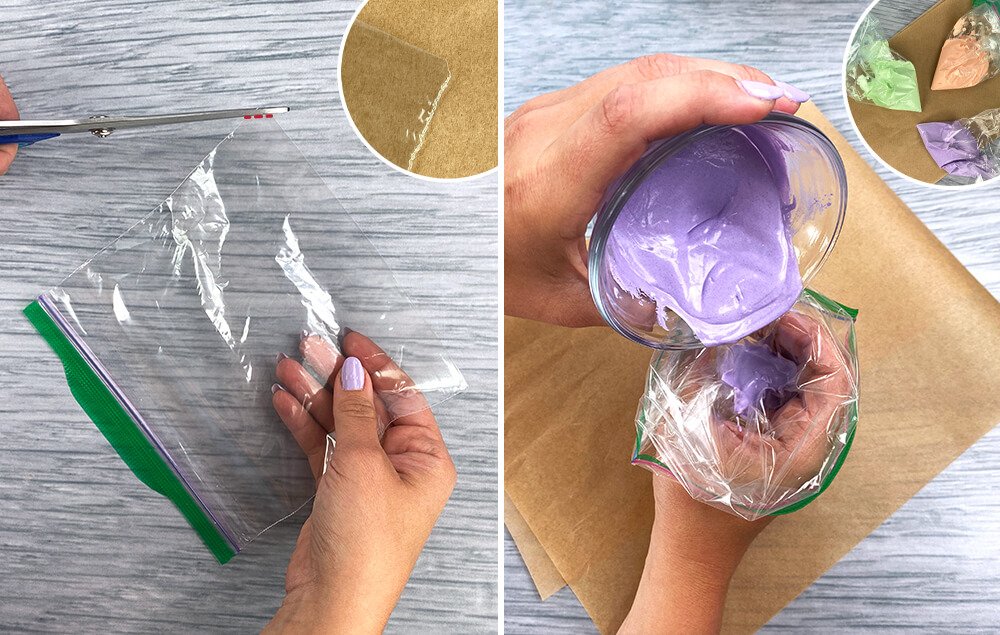 A) Cut a very small edge off the corner of a plastic sandwich bag to create a tiny hole. Prepare one bag for each color of chocolate.