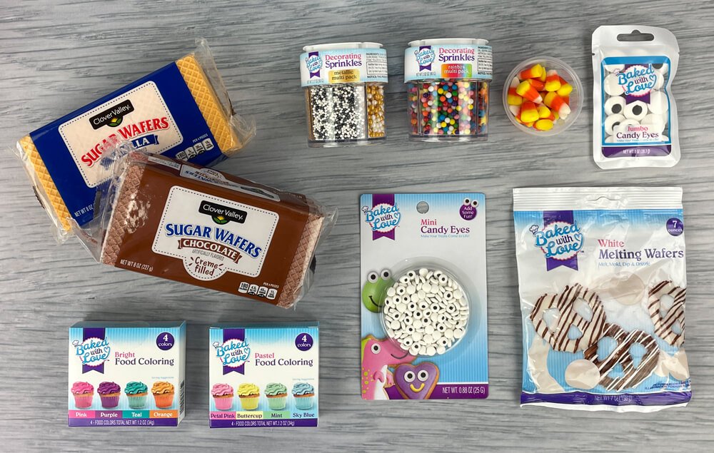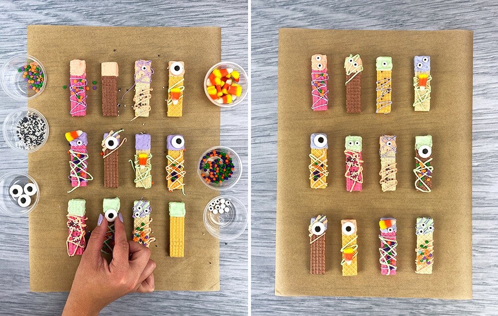 A) Decorate the wafer cookies with candy eyes, sprinkles and candy corn.