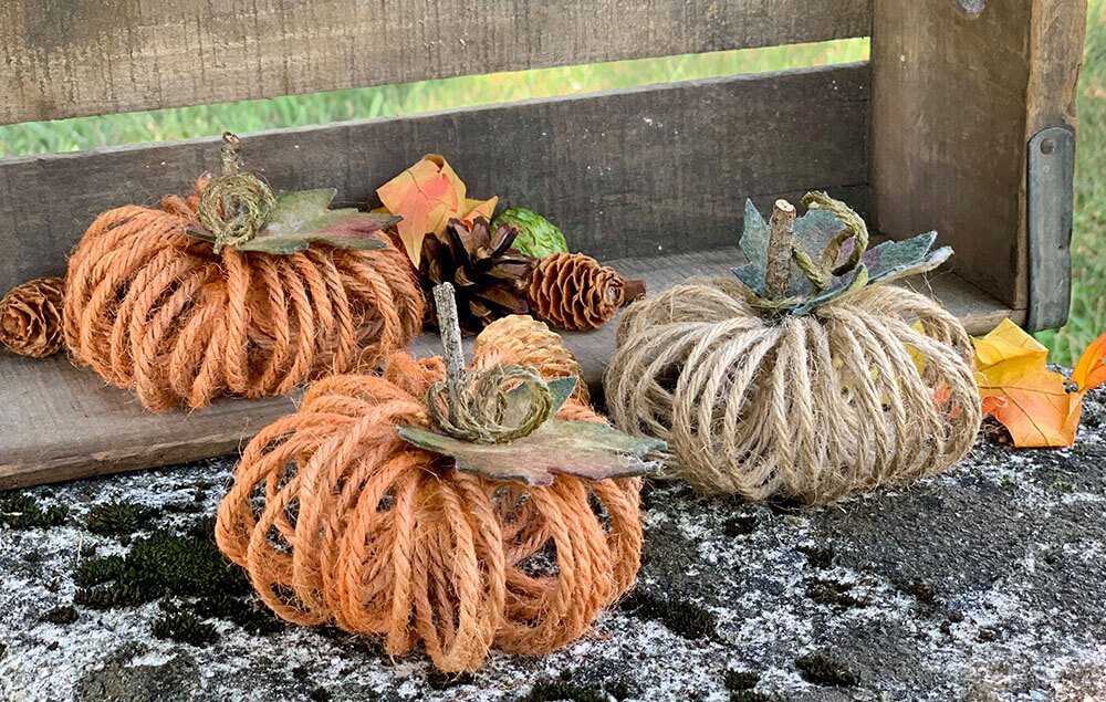 Hot glue a curly green jute piece, close to your “stem”, onto the top of each pumpkin to make a vine.