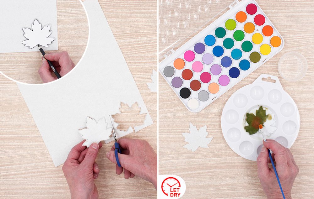Dye the leaves an olive green, with touches of brown, by saturating the felt with watercolor paint. Let dry.