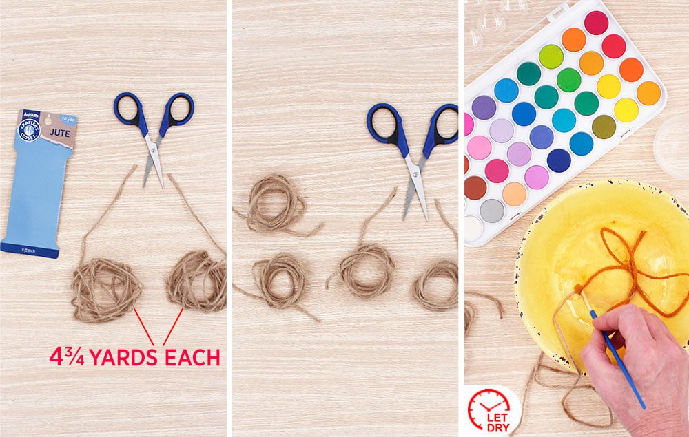 Dye two of the 2 3/8 yard strands of jute orange by saturating them with watercolor paint. Let dry. Set the other two undyed pieces aside for a later step.
