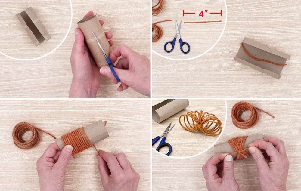 Cut a 4” piece of jute off one of the orange jute strands. Lay the 4” jute piece inside the cut paper tube.