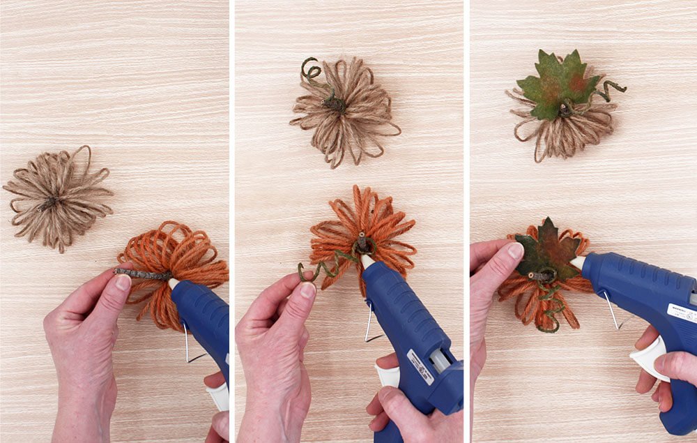 Hot glue a small stick onto the top of each pumpkin to make a stem.