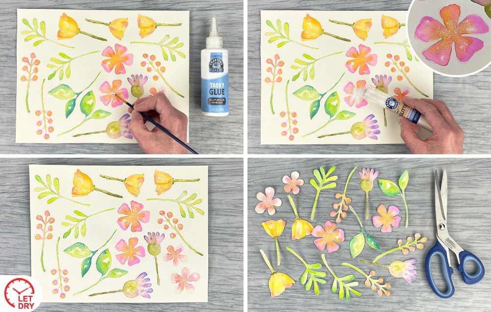 A) Apply tacky glue to highlight areas on the flowers and leaves.