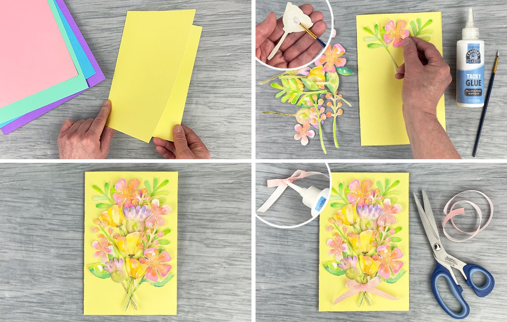 B) Apply tacky glue to the back of each flower and leaf. Add them to the card one at a time. Tip: Start at the top of the card and work down.