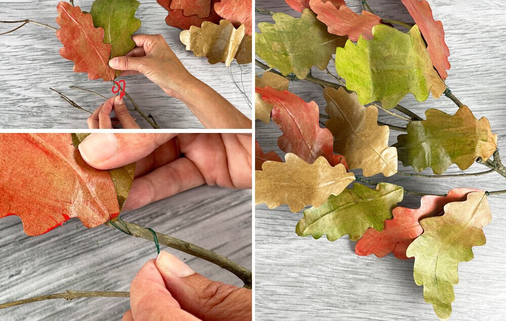 A) Twist the wire stems around a branch to attach the leaves. Tip: Cluster a few leaves together for a more natural look.