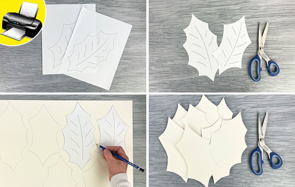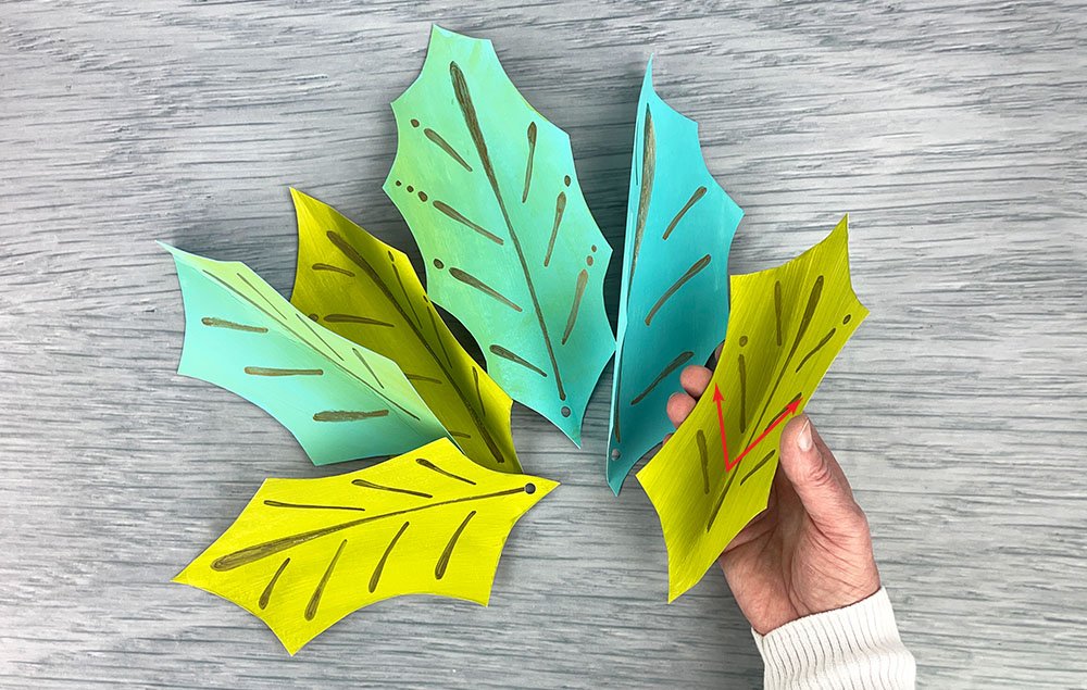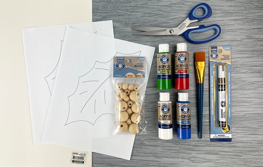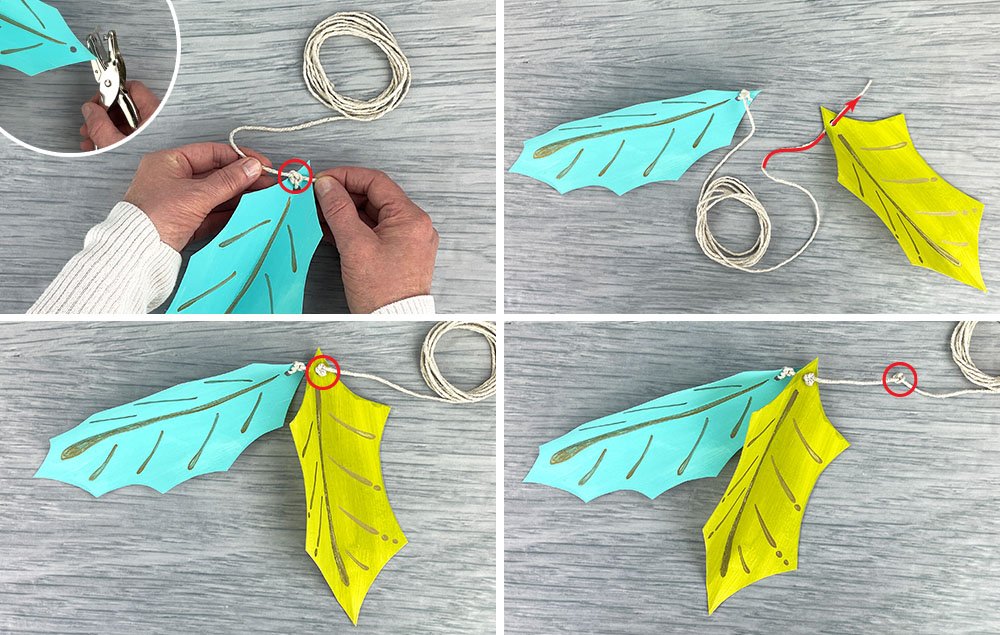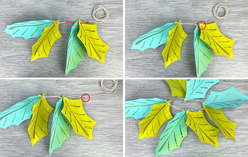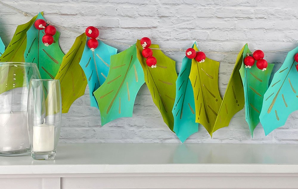Create a retro-inspired holly garland crafted from oversized poster board leaves. Interspersed with vibrant red wooden beads for berries, this large-scale garland adds a touch of vintage charm to your holiday décor.