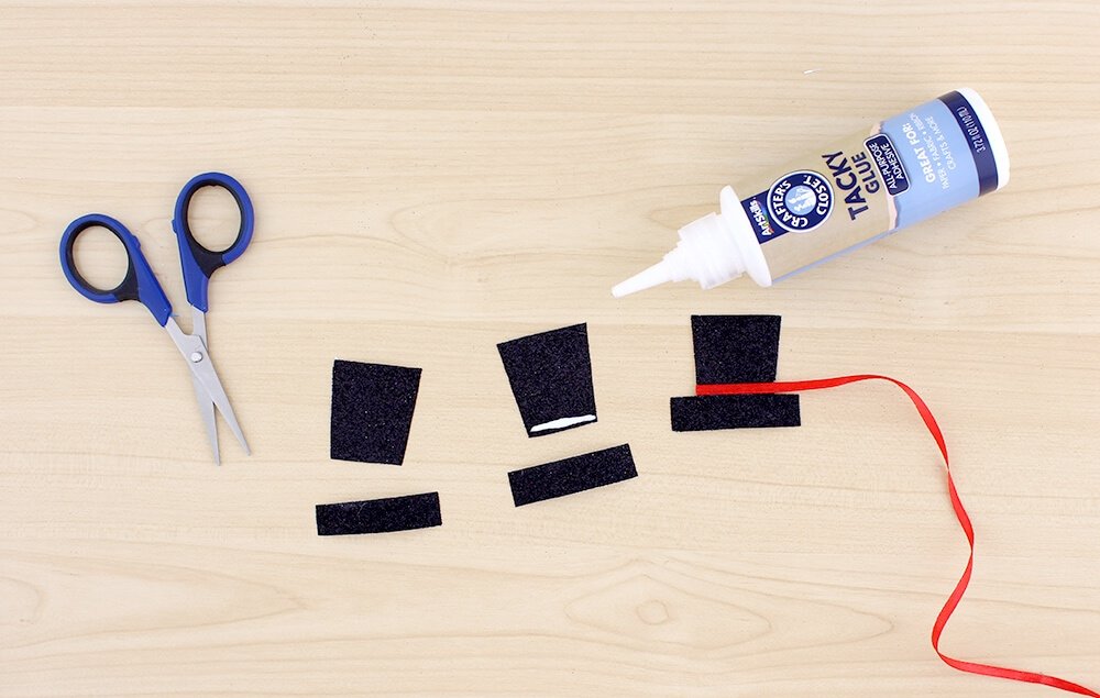 Make a hat out of glitter tape. Cut a rectangle for the hat and a small strip for the brim. Combine the pieces and add a strip of red detail ribbon. (Note: Leave release paper on the tape for this project.)