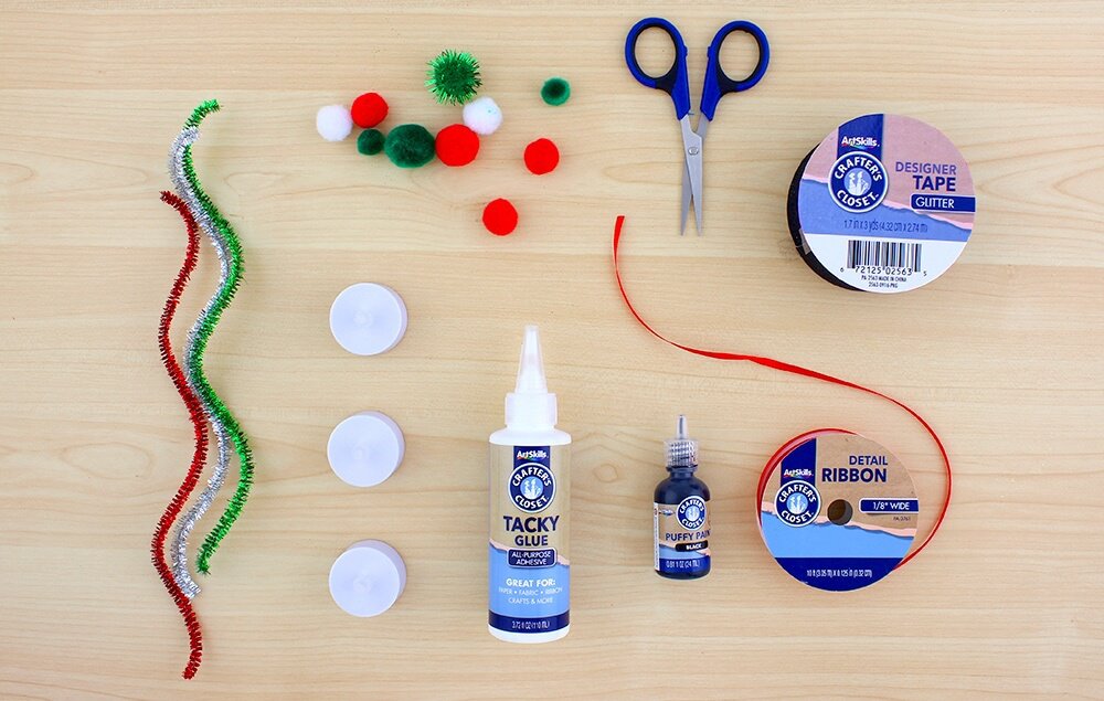 Use tacky glue to attach the top hat to the tea lights or attach pom poms, chenille stems and a ribbon to make cute earmuffs.