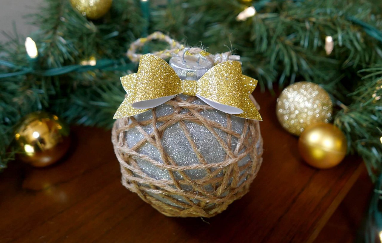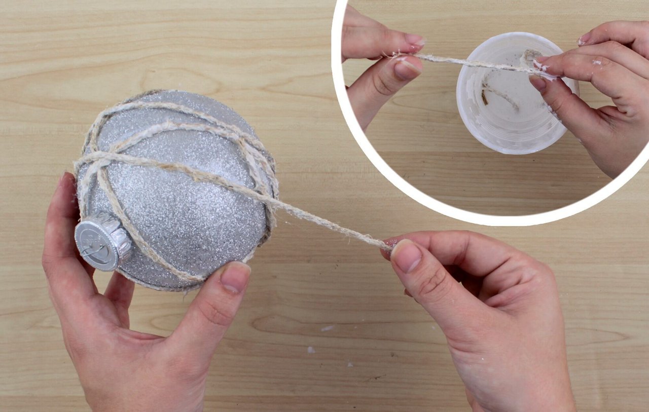 In a large plastic cup, combine tacky glue and a small amount of water – mix to combine. Dip each piece of twine into the glue mixture and remove once the twine is coated. Wipe away excess glue with your fingers. Wrap the glue covered twine around the ornament as pictured.