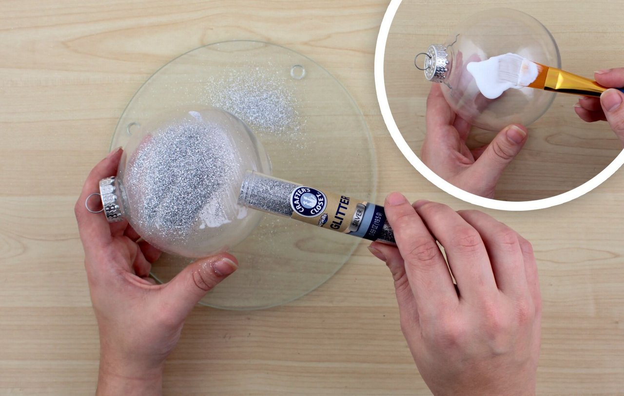 Cover the plastic ornament in a thin layer of tacky glue. While the glue is wet, sprinkle silver glitter over the ornament. Let dry.