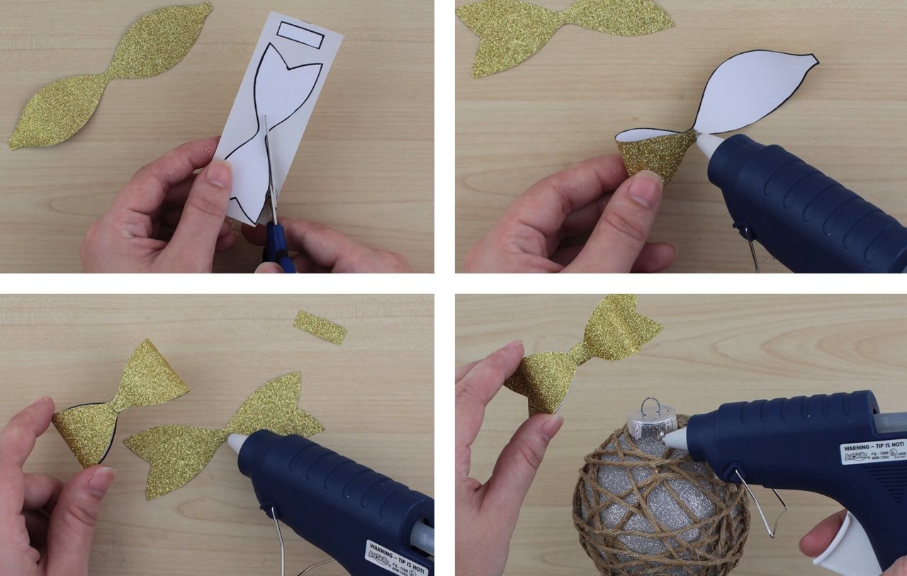 To make the glitter bow, download and print the supplied template shapes. Stick the template to the underside of the Glitter Duct Tape and cut out the shapes. Assemble and attach the bow to the top of the ornament using the hot glue gun.