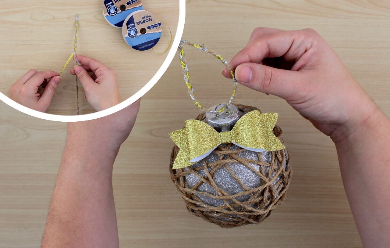 Braid together the extra piece of jute from Step 2 with a piece of gold and silver detail ribbon. Loop through the top of the ornament so you can decorate your tree or home!