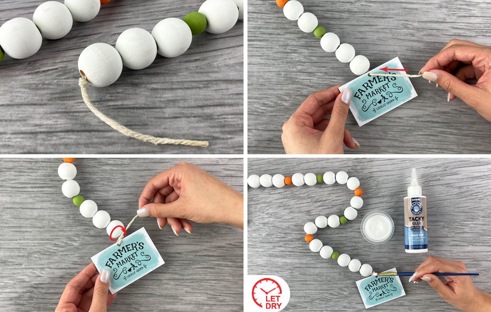 B) Slide the tag onto the craft cord at the end of the garland.