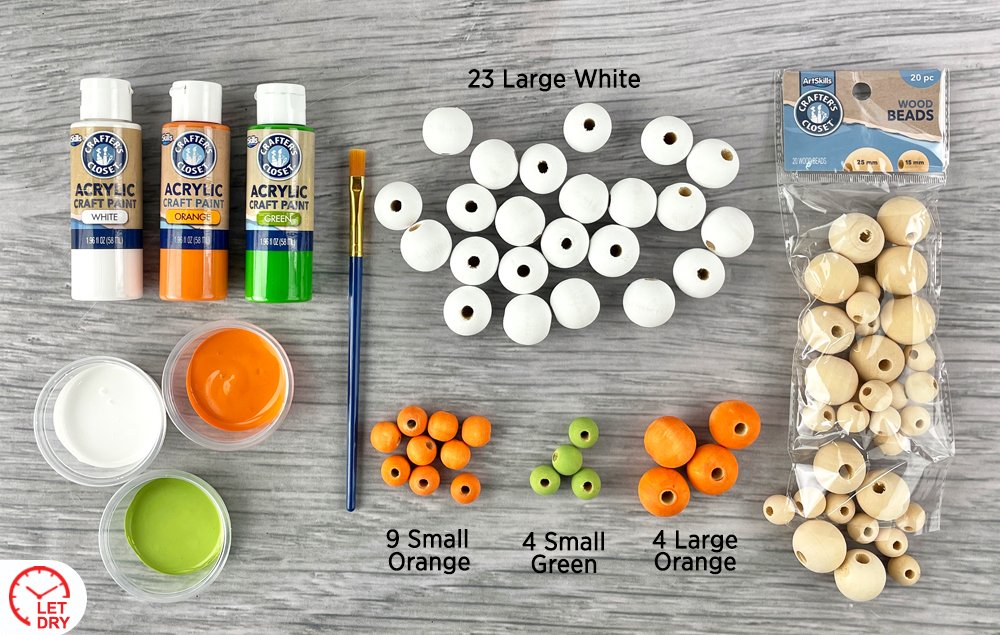 A) Paint the following wood beads: 23 Large White, 4 Large Orange, 4 Small Green, 9 Small Orange. Let the beads dry.
