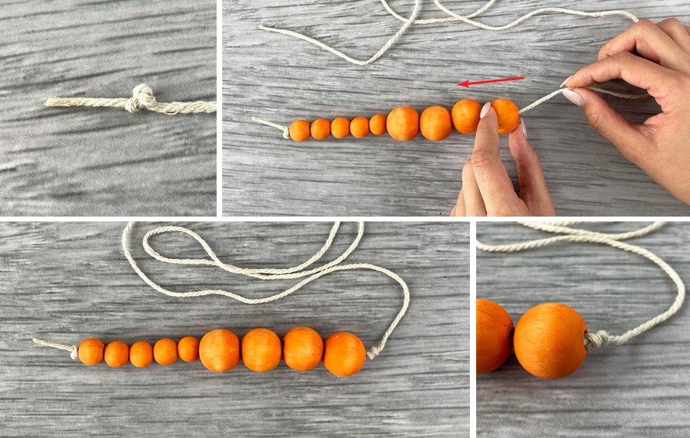 A) Tie a knot at the end of the garland to secure the wood beads in place.