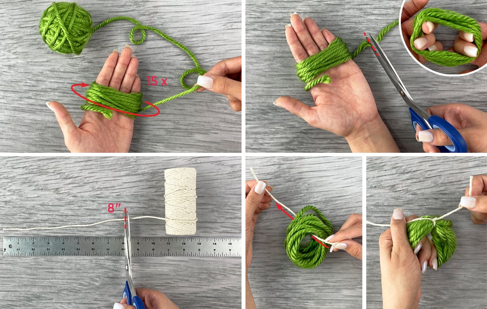 A) Wrap green yarn around the palm of your hand 15 times.