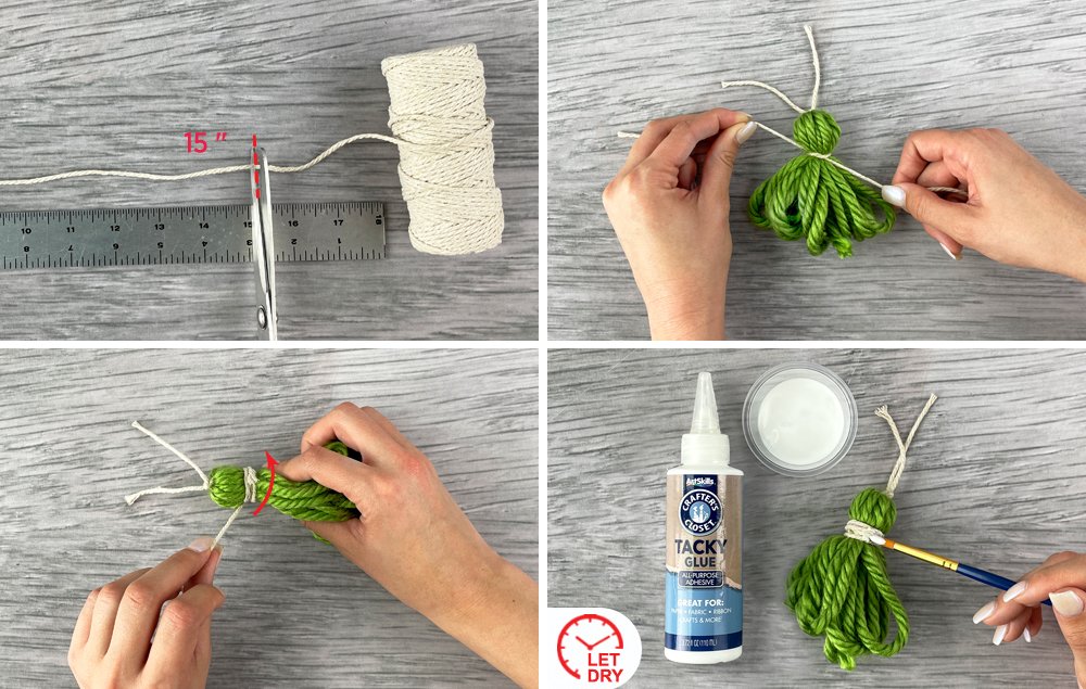 A) Tie the green yarn tassel to the knot at the end of the carrot.