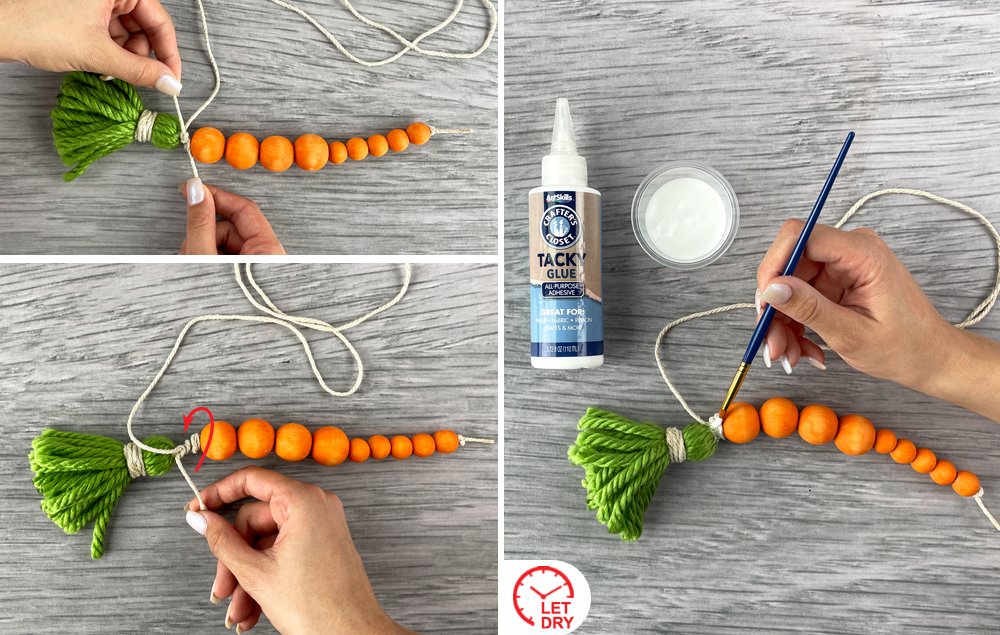 C) Tie a knot at the other end of the carrot to hold the orange wood beads in place.