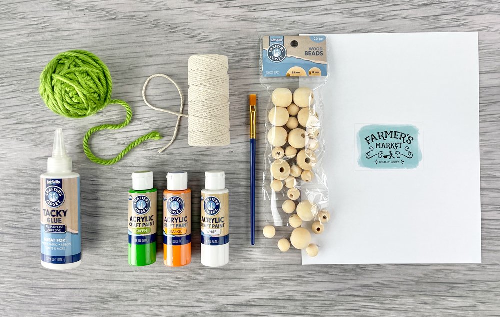 Craft an adorable carrot garland for spring! Orange-painted wood beads and a green yarn tassel create the fun carrot. Bright beads and a Farmer’s Market tag accent finish off the garland.