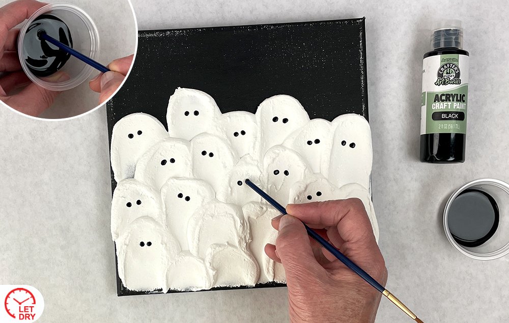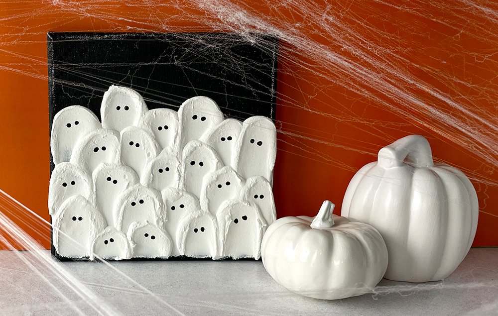 Create a spooky scene with this textured Halloween canvas featuring a gathering of ghosts. Set against a deep black background, the raised, dimensional ghosts add eerie depth and charm to your seasonal décor.