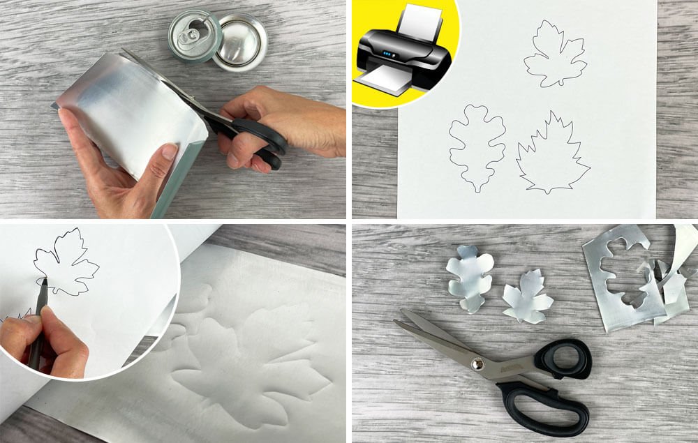 C) Lay the template over the metal soda can and use a pen to trace the leaf shapes. The pressure of the pen will indent the metal soda can below.
