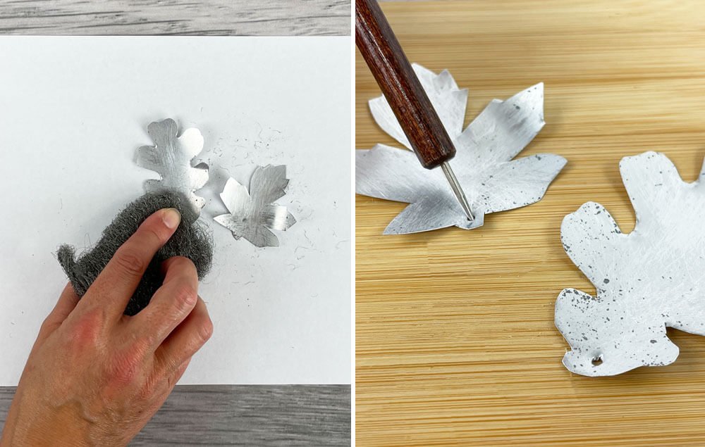 B) Poke a hole through each leaf. Note: You can poke a hole in the metal with a nail, craft knife, or pointy scissors.