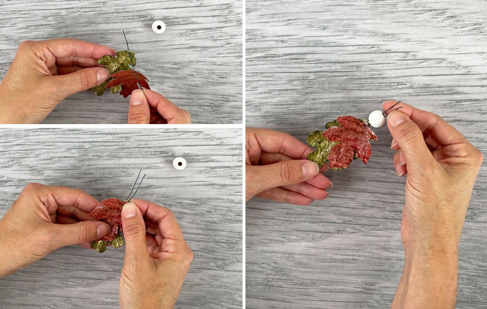 A) Thread a 3" piece of wire through the leaf holes. Note: You can also use a twist tie.