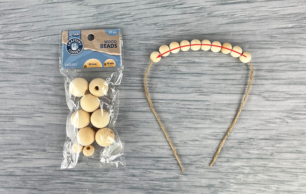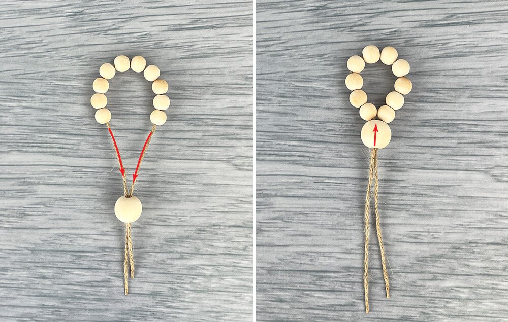 A) String a small bead onto both pieces of jute. Tie a knot at the end of both pieces of jute so that the beads dangle near the ends.