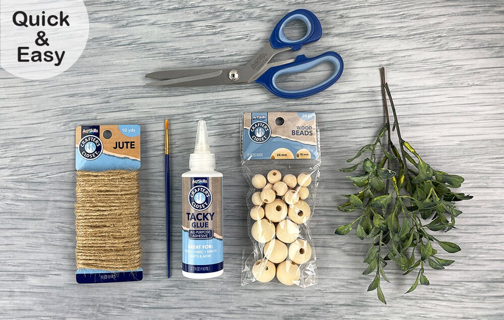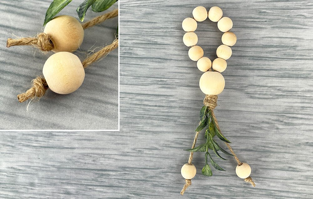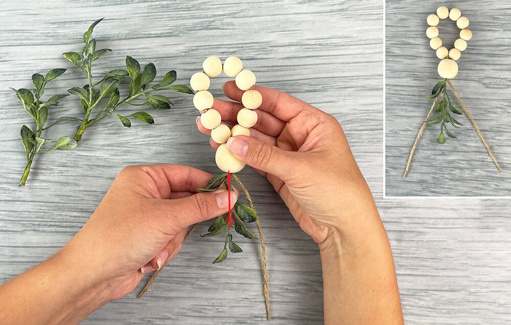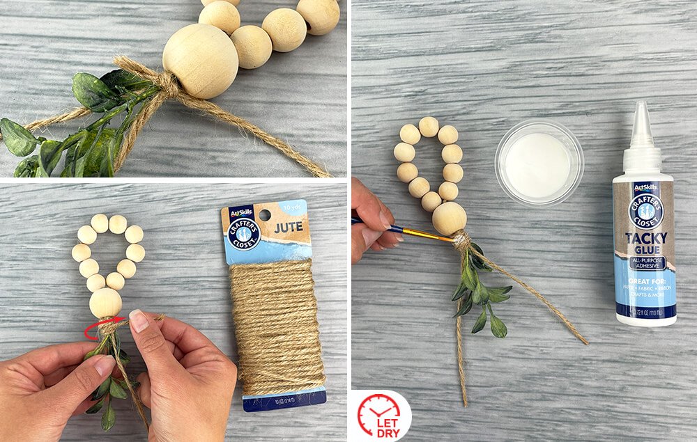 A) Wrap a piece of jute underneath the large bead, around the greenery and two jute strings from Step 2, and tie a knot.