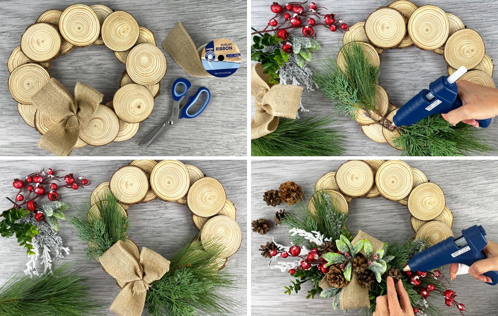 B) Begin hot gluing greens and berries to the wood slice wreath.