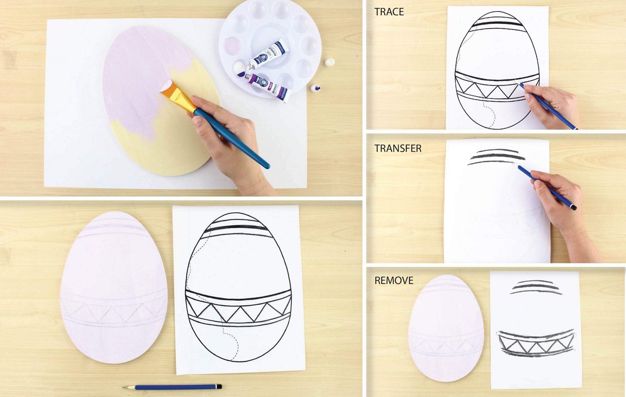 Using the downloadable template, trace over the designs on the front of the paper. Leave the dotted line, representing the bunny, for a future step. Carefully position the egg template over the Wooden Easter Egg Plaque and go back over the lines to transfer the original image. If you decide to make up your own egg design, skip this step!