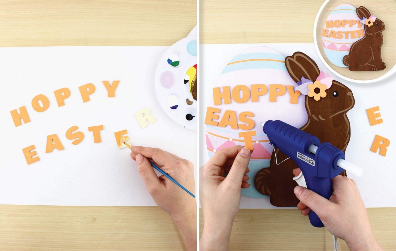 Carefully Hot Glue the letter to the Wooden Easter Egg Plaque.