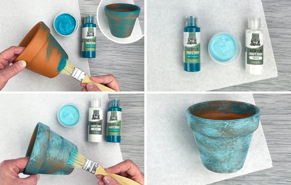 A) Randomly dab and swipe dark turquoise paint on the pot. Let some areas of the clay pot show through.