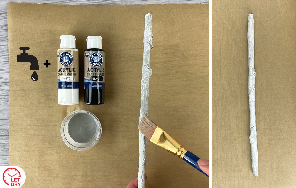 A) Make a gray wash by mixing black and white paint with water. The color should be thin. We used a ratio of ¾ water to ¼ paint. Brush the wash on the branch. Let dry.