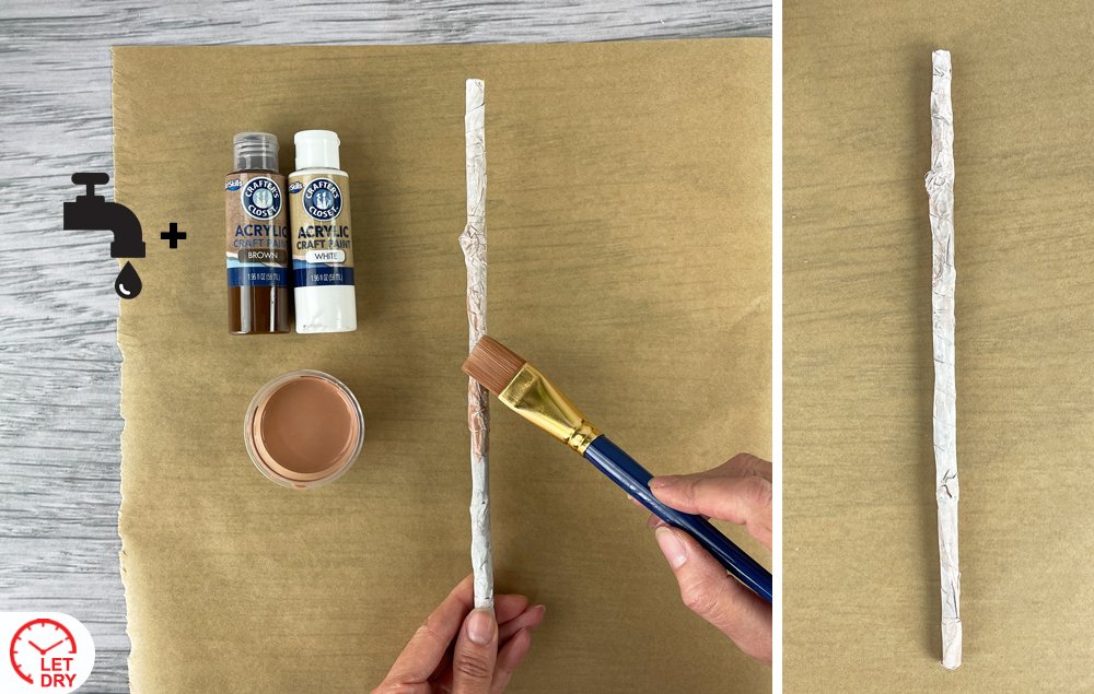 D) Crumple up small pieces of the kraft paper and deco podge them to the wood dowel to create little “knots” on the branch. Let dry.