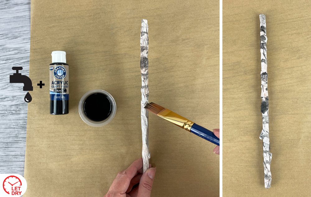 A) Make a black wash by mixing black paint with water. The color should be thin. We used a ratio of ½ water to ½ paint. Brush the wash on the branch to create random “stripes.” Let dry.