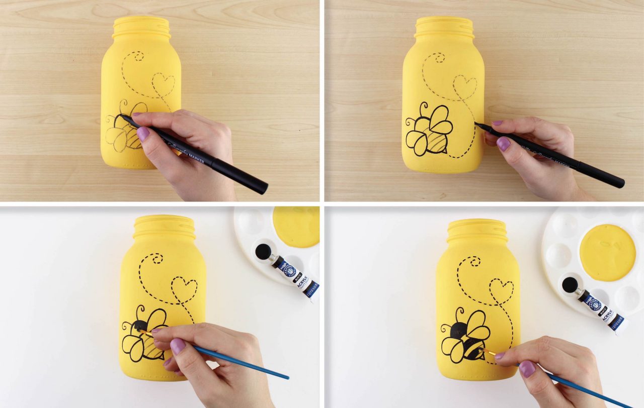 Take the black paint and a small brush. Fill in the appropriate areas of the bee, applying multiple coats as needed.