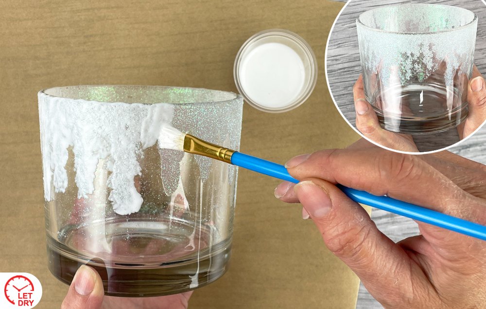 A) Use a stiff-bristle paint brush to dab deco podge around the top edge of the glass vase and down the sides. The application should be loose and irregular to mimic ice forming on the edge. Do not let the deco podge dry.