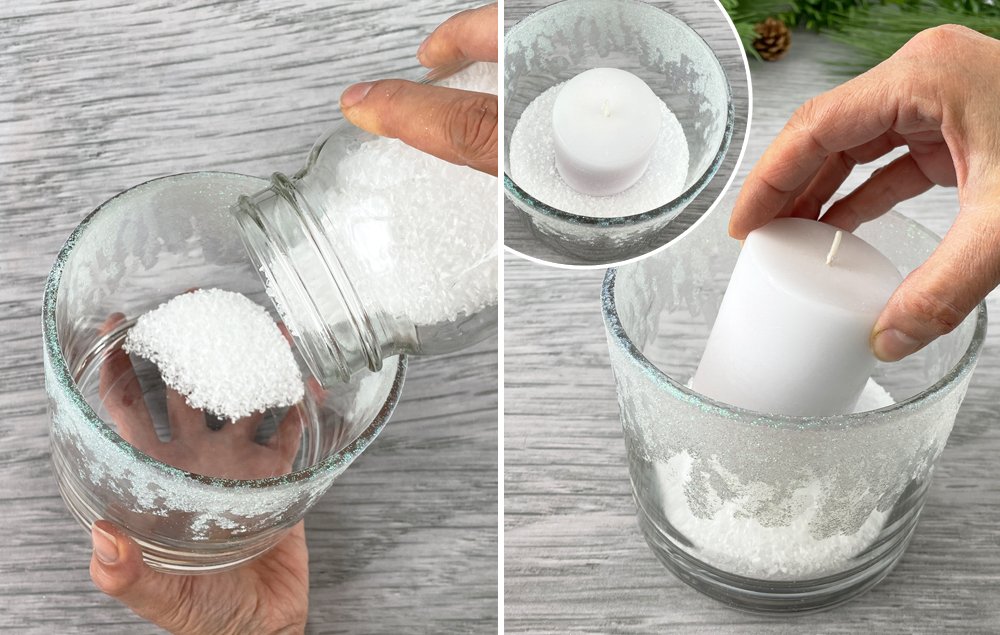A) Add epsom salt to the bottom of the vase to act as snow. Insert a candle.