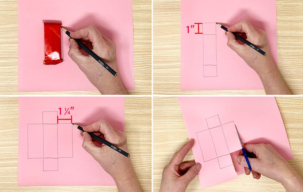 Trace rectangular wafer candy on pink paper.