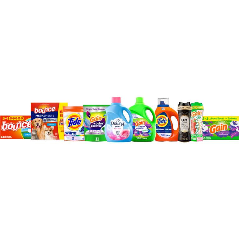 ONE Gain Liquid Laundry Detergent 61 Load/88 oz., Flings 31 ct., Super Flings 18 ct., Liquids Fabric Softener 136 Load/100 oz., Fireworks 10.7 oz. or 12.2 oz., Sheets 240 ct., or Tide Power Pods 18 ct., Pods 31 ct., Liquid Laundry Detergent 39-48 Load/55-63 oz., or Downy beads 10.7 oz. or 12.2 oz. or 13 oz., Liquid Fabric Softener 136 Load/100oz, Ultra Soft Liquid Fabric Softener 83 Load/56 oz, or Bounce Sheets 240 ct., or Pet Dryer Mega Sheets 130 ct. Reg. $9.95