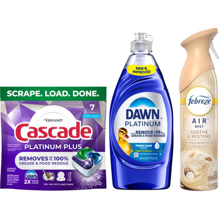 on select Febreze, Dawn, Cascade, Mr. Clean. Includes select Febreze Small Space 1ct, Dawn Dishwashing Liquid 21oz, Dawn Platinum Dishwashing Liquid 18oz, Dawn Powerwash Refill 16oz, Cascade Platinum Plus 7-9ct, Cascade Complete Fresh 13ct, Mr. Clean Liquid 6/23oz